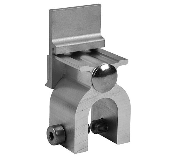 R-Medi Klemme zur Montage an runden Fugenprofilen (wie Kalzip, Bemo, Aluform, RIB-ROOF Evolution), Länge 40 mm, vormontiert mit Clip und Bolzen, 2 Befestigungsschrauben. Material: Klemme aus Aluminium, Schrauben aus Edelstahl A2 geeignet für K2 Singlerail und Crossrail Schienen