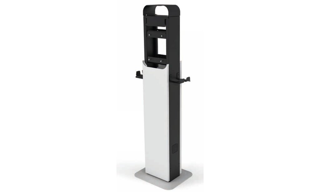 Robusta stazione di ricarica per l’installazione indipendente e bifacciale di due eCharger SMA (EVC22-3AC-20), in lamiera d’acciaio zincata e verniciata a polvere, con supporto per cavi, vano di connessione per distributore integrato, predisposto per l’installazione di una presa esterna, collegamento a vite con piedino opzionale EVC-GD-PDSTL-10